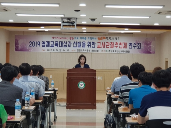 | 경상북도김천교육지원청(교육장 신정숙)은 지난 24일(금) 오후 2시 30분 김천교육지원청 대회의실에서 관내 초·중학교 관리자와 영재업무 담당교사 80여 명을 대상으로 「2019학년도 영재교육대상자 선발을 위한 교사관찰추천제 연수회」를 개최하였다.