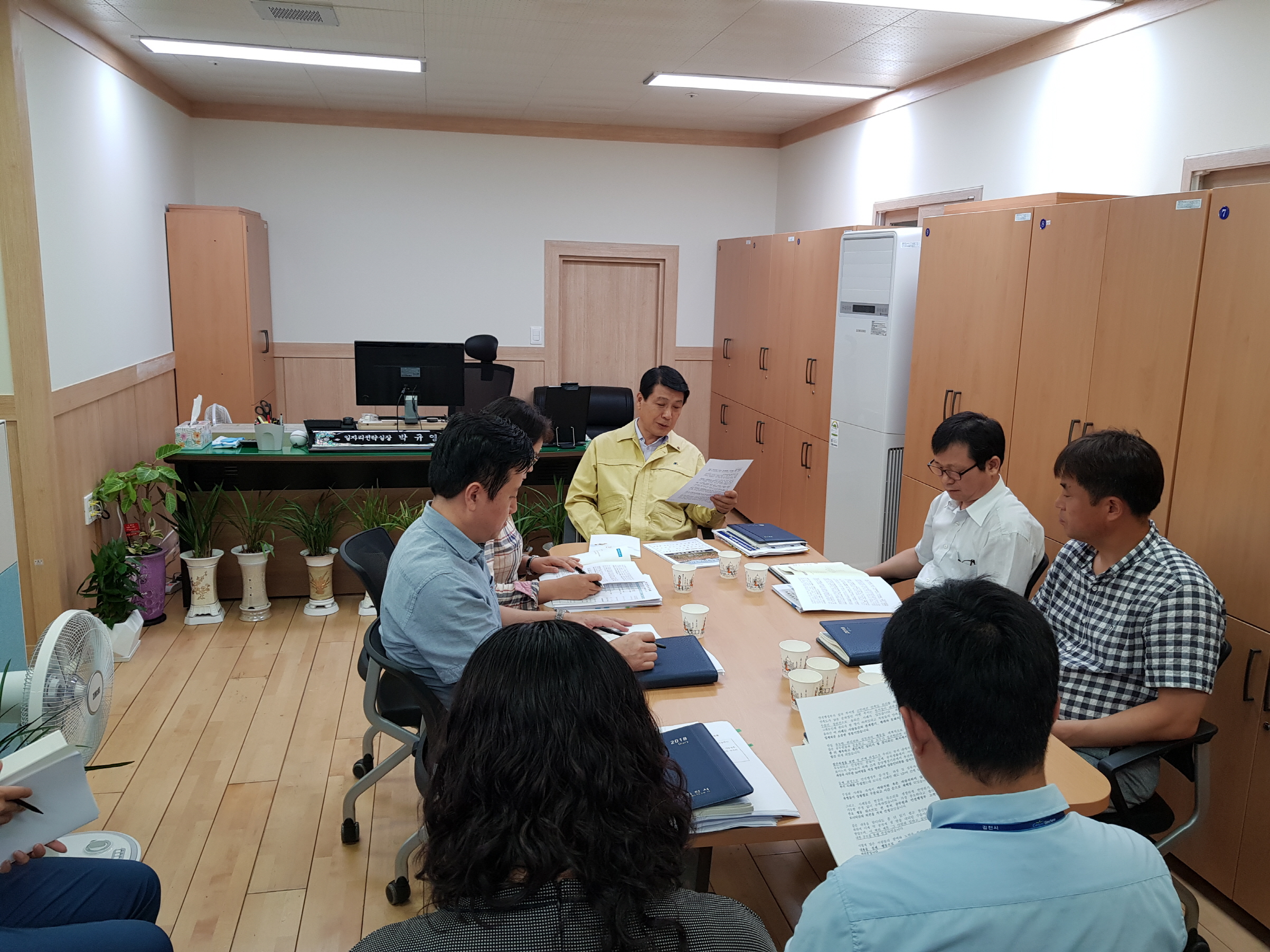 | 김천시 일자리전략실 전 직원은 8월 27일 청렴 실천의 날을 맞이하여 ‘청렴실천의 날 다짐 낭독’과 ‘역사 속에서 찾은 청렴인물 소개와 청렴이야기’를 주제로 의견을 나누고 토론하는 시간을 가졌다.