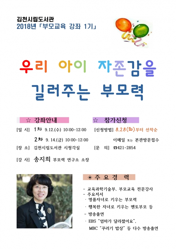 | 김천시립도서관(관장 장귀희)에서는 9월 12일(수), 14일(금) 오전 10시 시립도서관 시청각실에서 송지희 강사(부모력연구소 소장)를 초청하여 강연회를 개최한다.