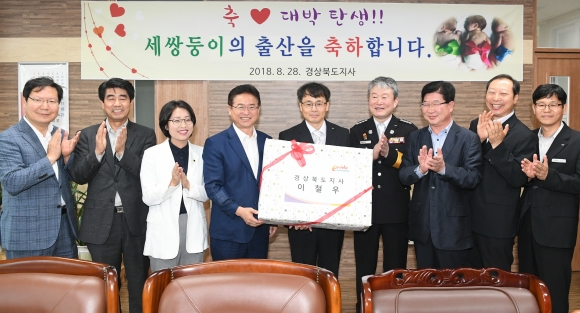 | 이철우 경상북도지사는 28일(화) 오후5시 경산소방서 회의실에서 세쌍둥이를 출산, 다둥이 아빠로 경사를 맞은 이기찬 소방관을 찾아 축하 격려하고 애기 육아용품을 전달했다. 다둥이 아빠가 된 이기찬씨는 청도소방서 구조구급과에 근무하고 있으며, 배우자는 이번이 첫 출산으로 지난 24일(금) 16:50분경 대구 동산병원에서 세쌍둥이를 순산했다.