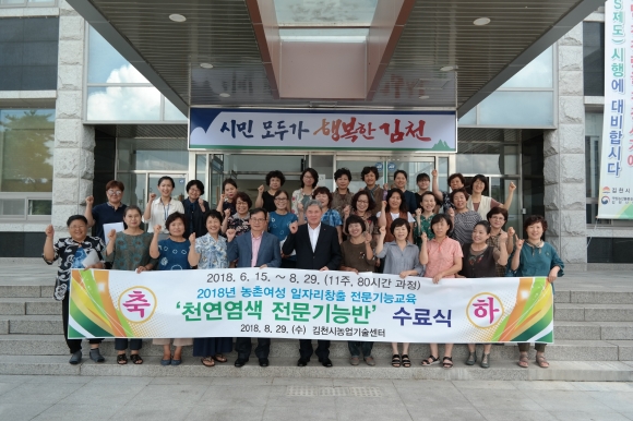 | 김천시(시장 김충섭)는 8월 29일 농업기술센터에서 30명의 교육생을 대상으로 농촌여성 일자리창출 전문기능교육 ‘천연염색 전문기능반’에 대한 수료식을 가졌다.