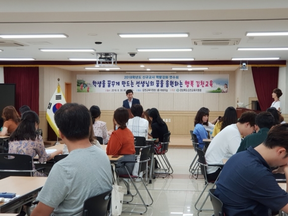 | 경상북도김천교육지원청(교육장 신정숙)은 지난 30일 김천교육지원청 대회의실에서 김천에 근무하는 경력 3년 미만 신규교사 50명을 대상으로 2018학년도 신규교사 역량강화 연수회를 개최하였다.