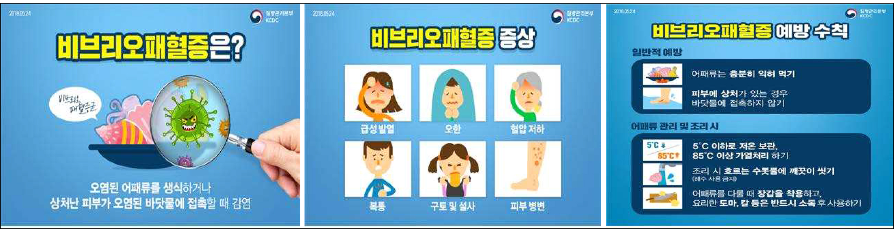 비브리오 패혈증은 오염된 어패류를 생식하거나 상처 난 피부가 오염된 바닷물에 접촉할 때 생기는 질환으로, 일반적으로 해수온도가 상승하는 5~6월경 발생하기 시작해 8~9월에 집중적으로 발병한다. 증상으로는 급성발열, 오한, 혈압저하, 복통, 구토, 설사, 발진이나 수포 등의 피부 병변이 있고, 특히 간질환자, 알코올 중독자, 당뇨병, 면역저하자(항암제 투여자, 장기 이식자 등) 같은 고위험군은 치사율이 50%까지 높아지기 때문에 더욱 주의가 요구된다.