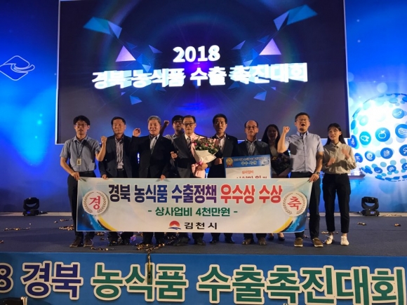 | 김천시(시장 김충섭)는 31일 안동 그랜드호텔 그랜드볼룸에서 열린 경북 농식품 수출촉진대회에서 ‘2018년 경북 농식품수출정책 우수기관으로 선정’되어 상사업비 4천만원과 시상금 2백만원을 수상하는 쾌거를 이뤘다.