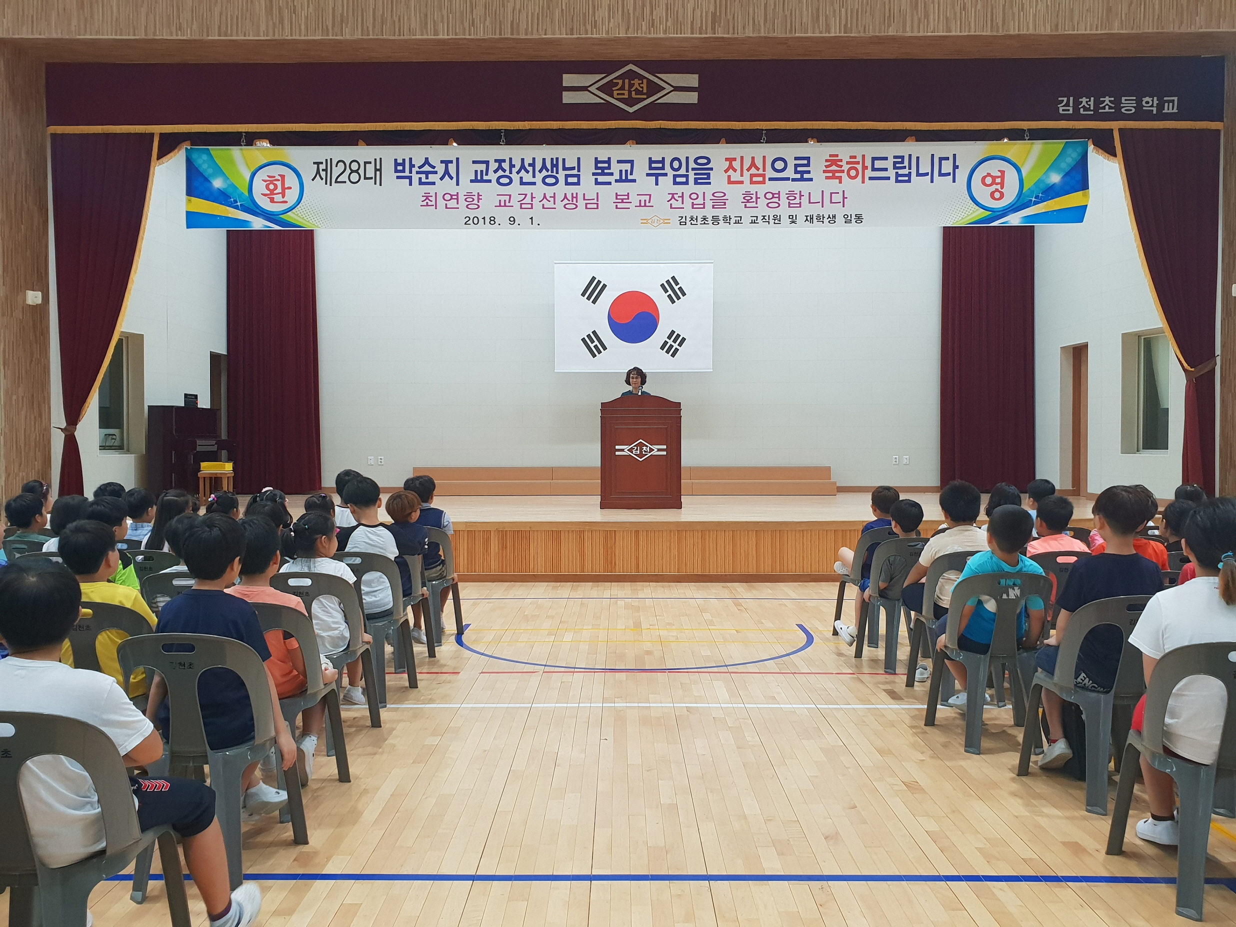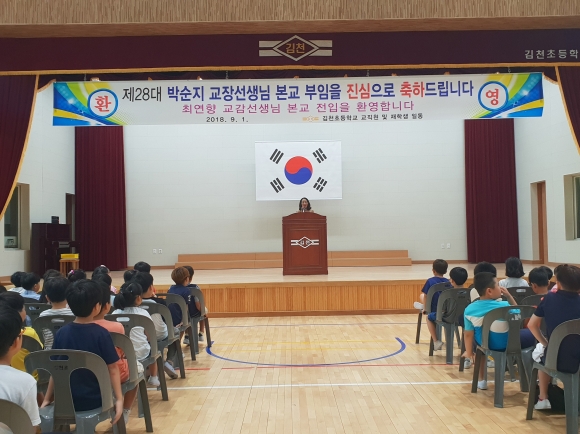 | 지난 9월 3일(월)에 학교 강당(남산관)에서 김천초등학교에 부임하신 제28대 박순지 교장선생님의 취임식과 최연향 교감선생님의 환영식을 가졌다.