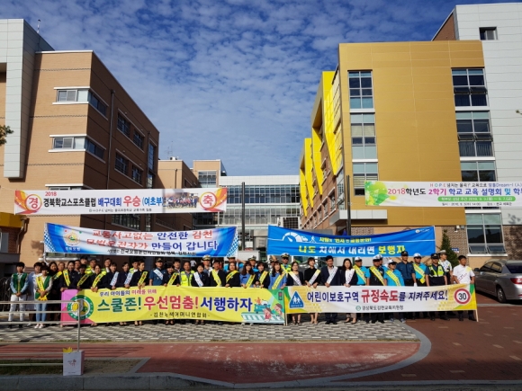 | 김천시는 11일(화) 오전 7시 50분부터 1시간 동안 율곡초등학교 일원에서 김천경찰서, 김천교육지원청, 모범운전자회, 녹색어머니회, 율곡초등학교 교직원 등 60여 명이 참석하여 개학기 학교 주변 안전점검을 위한 교통안전 캠페인을 실시하였다.