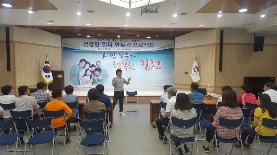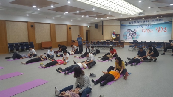 | 김천시가 건강관리를 통한 활력 있는 직장 분위기 조성을 위하여 발 벗고 나서고 있다. 시에서는 『건강한 신체, 시정의 동력이자 자산입니다.』라는 구호아래 지난 10일부터 직원 30여명을 대상으로 건강한 일터 만들기 프로젝트를 시작하였다.