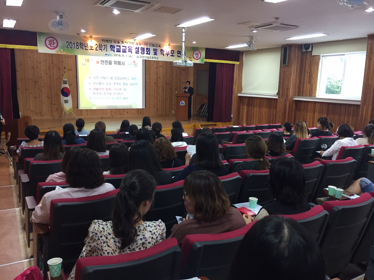 | 김천신일초등학교(교장 권명준)는 9월 7일 본교 시청각실에서 ‘교육의 4주체가 함께하는 행복한 김천 신일 교육’실현을 위한 「2학기 학교교육설명회」를 개최하였다. 김천교육지원청 정진표 교육지원과장, 학교운영위원장 및 학부모 대표, 1~6학년의 학부모님 및 교직원, 외부강사 등 100여명이 참석하였다.