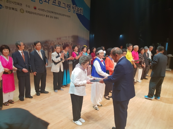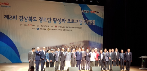 | 사)대한노인회 경상북도 경로당관역지원센터의 주관으로 제2회 경로당활성화 프로그램발표회를 2018년 9월 11일 경산시 경산시민회관에서 성대하게 개최하였다. 이날 내빈으로 대한노인회 양재경 경북연합회장, 경북도청 하경미 효노인복지과장, 경산시 최대진 부시장과 강수명 의회의장, 반용석 국제로터리3700지구총재, 대한노인회 중앙회 경로본부 김주호 과장과 22개 시.군 지회장과 전 직원이 함게 참석하여 자리를 빛냈다.