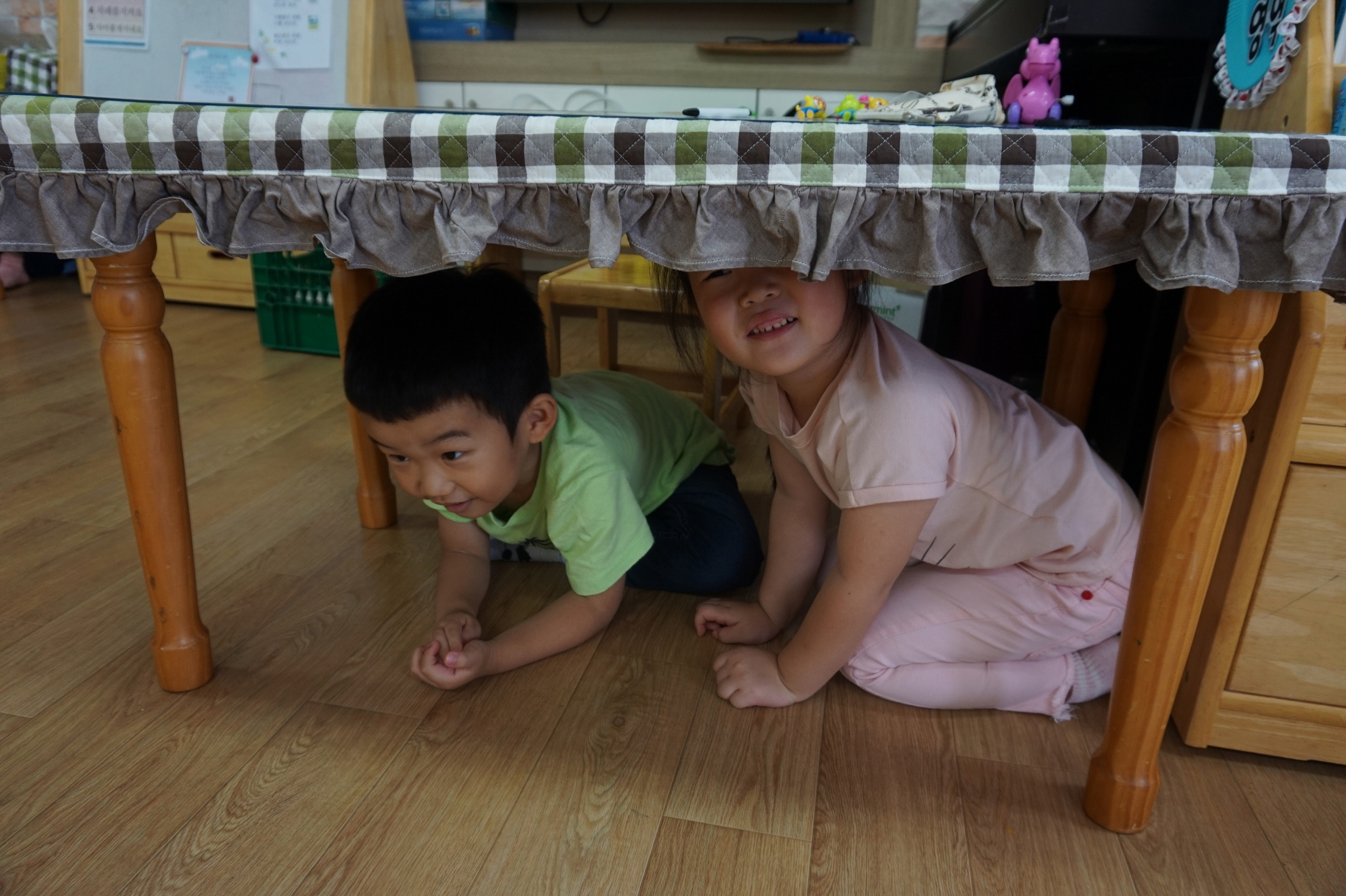 지진발생 재난 경보 방송이 울리자 유아들은 식속하게 머리를 감싸고 책상 아래로 몸을 숨겼다. 이어서 진동이 끝났다는 안내방송이 나오자 교사의 인솔 아래 유아들은 가방으로 머리를 감싸고 각반 대피 경로를 따라 본원의 지진대피소로 신속하게 대피하였다.