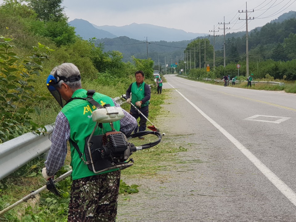 새마을회원들은 바쁜 농사일을 뒤로하고 이른 새벽부터 작업을 실시하여 국도 3호선 18km 구간을 비롯한 관내 주요 도로변 및 마을 진입로 등에 웃자란 칡덩쿨과 풀들을 깨끗하게 정리하였다.