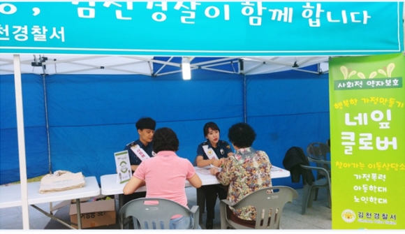 | 김천경찰서(서장 김우락)에서는 13일 오후 율곡동 안상공원에서 진행된 건강 체험 한마당에서 ‘건강가정 만들기’라는 주제로 찾아가는 가정폭력 이동식 상담소 네잎클로버를 운영하였다.