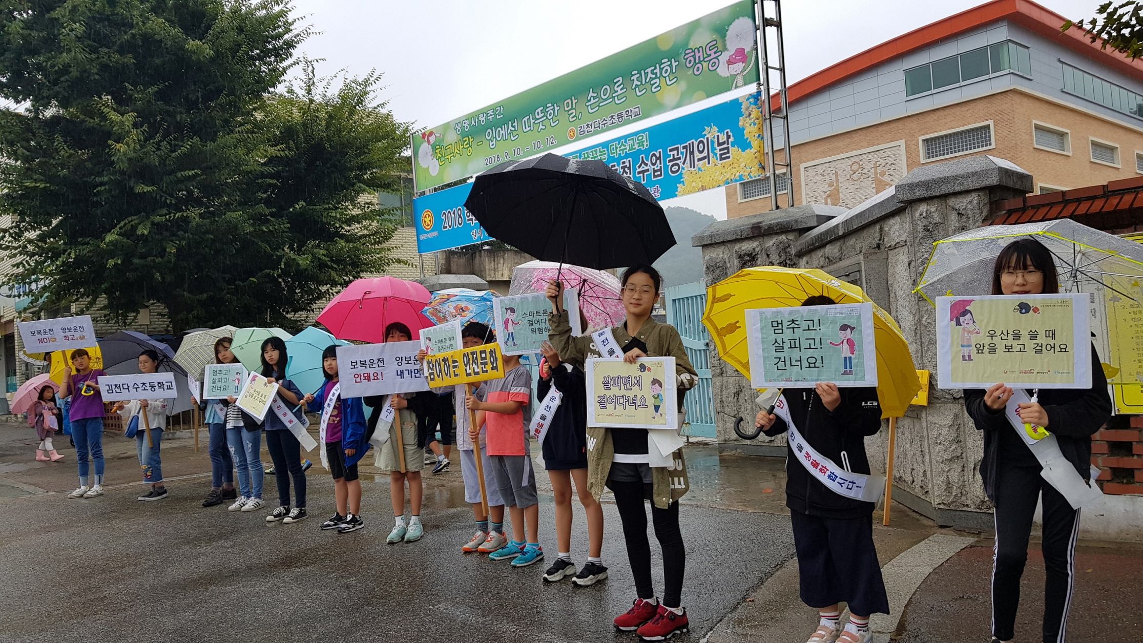 | 김천시 김천다수초등학교(교장 심상영)는 지난 7일(금) 1-2학년 학생을 대상으로‘어린이 교통안전교육’을 실시하였고지난 9월 14일(금) 4-6학년 전교어린이회 임원들이 ‘교통안전캠페인’을 실시하였다.