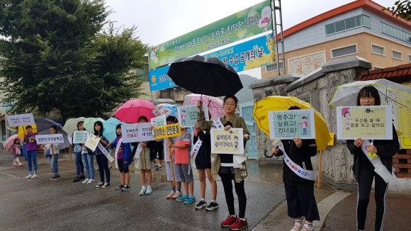 교통안전캠페인은 비가 내리는 궂은 날씨에도 불구하고, 10여명의 학생들과 교직원이 참석하여 등·하굣길 교통안전을 위해 피켓과 플랜카드 등을 활용하여 교통안전사교 예방 홍보활동을 전개하였다.