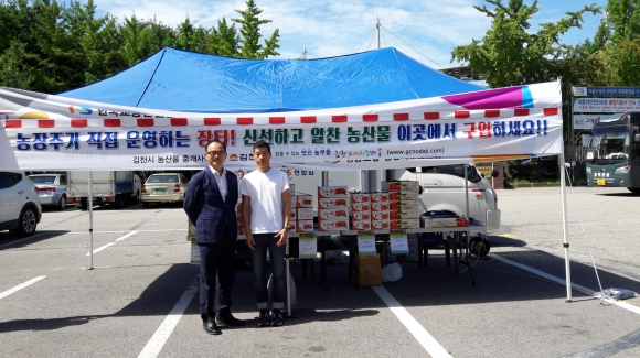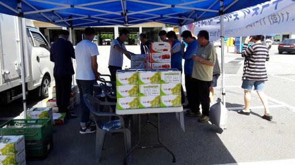 | 김천시(시장 김충섭)에서 운영하는 김천농특산물 대표 쇼핑몰인 ‘김천노다지장터(www.gcnodaji.com)'는 지난 11일, 13일 양일간 금년도 김천자두포도축제에 참여한 교통안전공단 지역본부의 대형 자동차검사소에서 임직원과 검사소 방문고객을 대상으로 추석맞이 농산물 직거래 장터를 개최했다.