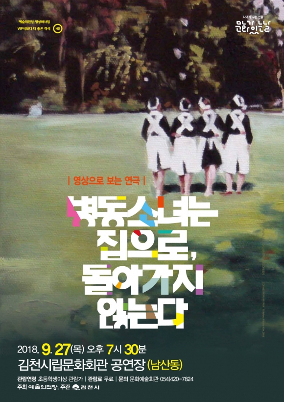 | 김천시문화예술회관(관장 김금숙)에서는 영상으로 보는 연극 <병동소녀는 집으로, 돌아가지 않는다>를 오는 9월 27일(목) 오후 7시 30분 김천시립 문화회관 공연장(남산동)에서 상영한다.