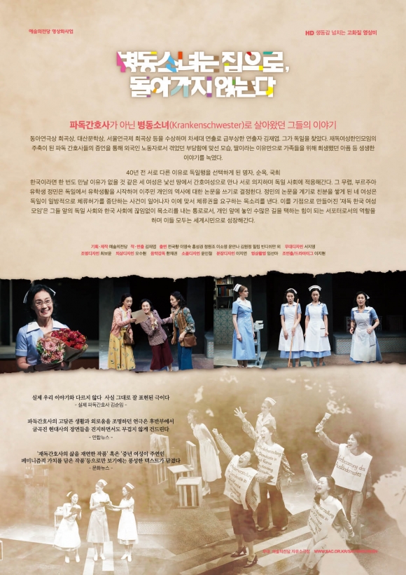 연극 ‘병동소녀는 집으로, 돌아가지 않는다’는 재독여성한인모임의 주축이 된 파독 간호사들의 증언을 통해 외국인 노동자로서 겪었던 부당함에 맞선 모습, 딸이라는 이유만으로 가족들을 위해 희생했던 아픔 등 생생한 이야기를 담아낸 작품이다. 이들이 무대 위에서 만들어내는 역사 속 독일 사회를 통해 당시 이주민 여성 노동자의 삶을 엿볼 수 있으며, 더 나아가 현재 우리 사회가 직면하고 있는 여성 또는 외국인 이슈에 대해서 한 번 더 생각할 계기를 마련해 줄 것이다.