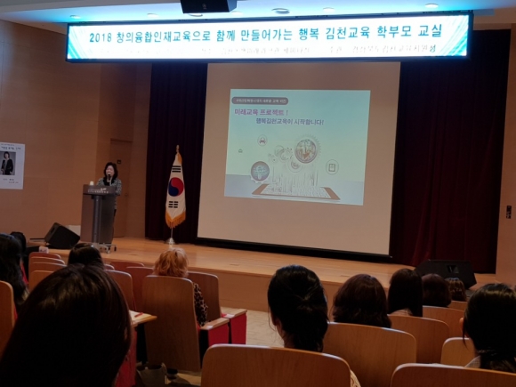 | 경상북도김천교육지원청(교육장 신정숙)은 9월 18일(화) 오전 10시 김천녹색미래과학관 세미나실에서 2018 창의융합인재교육으로 함께 미래를 만들어가는 행복 김천교육 학부모 교실을 개최하였다.