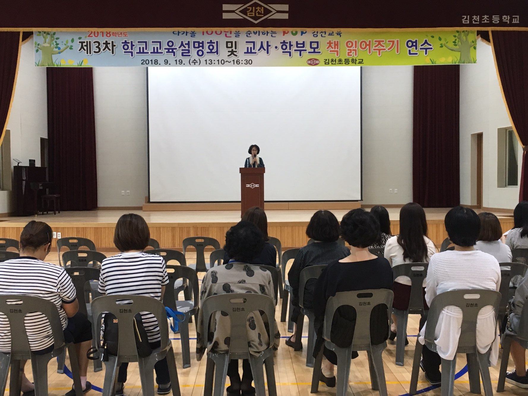 | 김천초등학교(교장 박순지)은 지난 19일(수) 오후 2시 학교 강당(남산관)에서 2018학년도 2학기 학교 교육계획 설명회를 개최하였다.