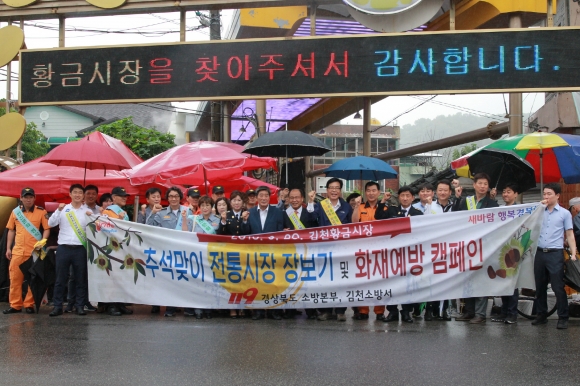 이날 행사는 김천 황금전통시장에서 송언석 국회의원, 나기보 도의원, 박판수 도의원과 경북소방본부 및 김천소방서 소방공무원, 의용소방대 등 100여명이 참여한 가운데 미리 구입한 온누리상품권으로 추석 제수용품과 생필품을 구입하고 추석명절『고향집, 주택용 소방시설 선물하기』 캠페인을 펼쳤다.