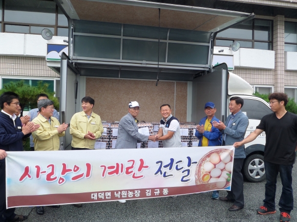 | 대덕면 관기리에서 양계업을 운영하는 낙원농장(대표 김규동)은 살아 계시는 동안 이웃사랑을 실천하신 부친의 기일을 맞아 관내 33개 경로당에 계란 330판을 전달했고, 다가오는 23일 추석을 맞이해 개최되는 대덕면민 가요 콩쿨 대회에 참가하신 분들에게 계란 1백판을 부상품으로 지원하기로 했다.