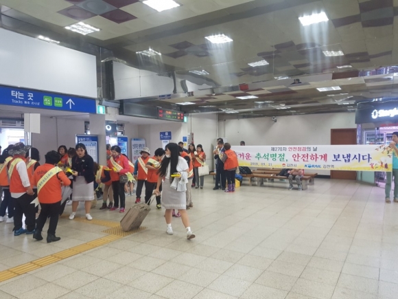 이날 캠페인은 추석 명절을 맞아 김천역과 KTX 김천(구미)역을 이용하는 고객들을 대상으로 각종 안전사고 발생 시 행동요령과 건강한 명절나기 요령 등 안전정보가 담긴 리플릿과 안전 홍보용품을 전달하고 안전의식을 고취하는 홍보활동을 전개했다.