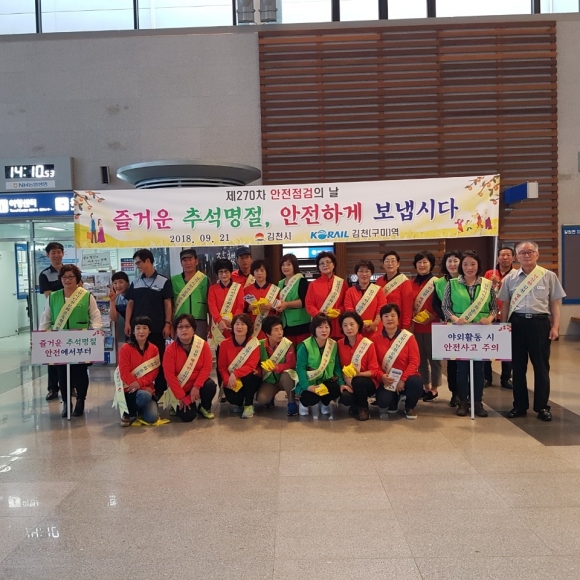 | 김천시(시장 김충섭)는 재난안전 특별대책기간(9.17~9.26)중 추석 명절을 맞이하여 9월 21일(금) 김천역과 KTX 김천(구미)역에서 안전보안관, 안전 문화운동 협의회 회원, 김천시 공무원, 코레일 직원 등 50여명이 참석한 가운 데‘즐거운 추석 명절 안전하게 보내기’를 주제로 캠페인을 실시하였다.