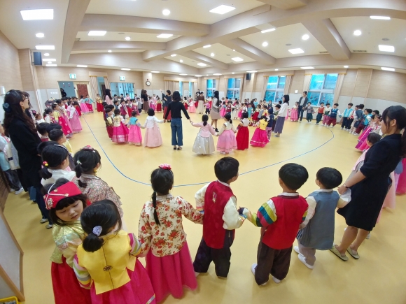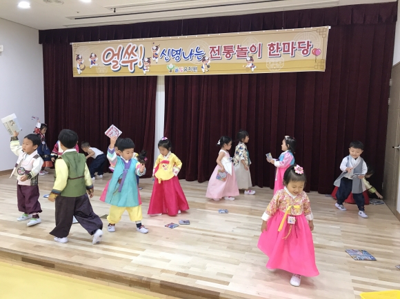 전통의상 한복을 입은 유아들이 다함께 한마음을 모아 손을 잡고 강강술래를 하였으며 이후 학급별로 제기차기, 비석치기, 인절미 만들기, 엉덩이씨름 등 다양한 전통놀이를 직접 체험하였다.