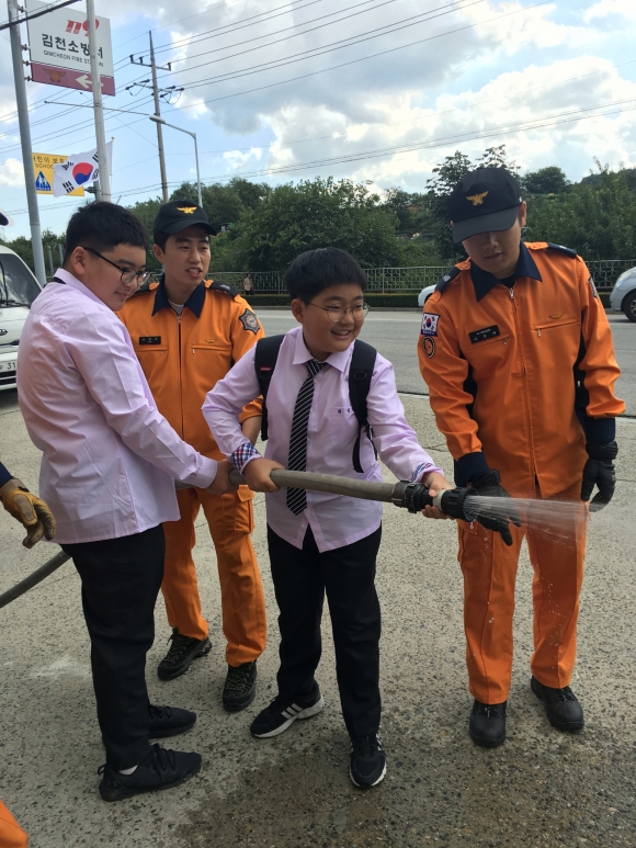 | 김천소방서(서장 이주원)는 1일 오전 석천중학교 1학년 50명을 대상으로 미래소방관 체험교실을 운영했다.