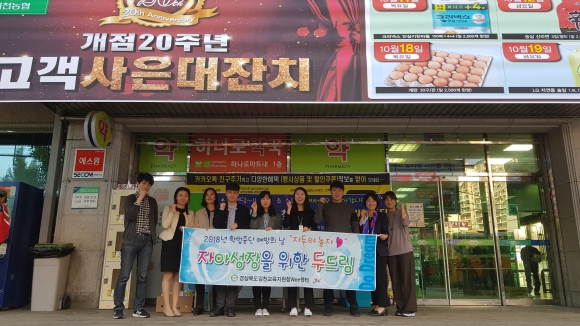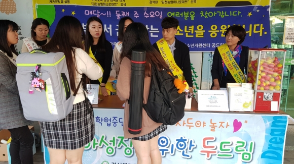 | 경상북도김천교육지원청(교육장 신정숙) Wee센터는 지난 10일(수) 김천농협하나로마트 및 김천공용버스터미널 일원에서 김천 관내 학생, 학부모 200여명을 대상으로 학업중단 예방 및 학교적응력 향상을 위한 ‘학업중단 예방의 날’ 캠페인을 실시했다. 김천교육지원청 Wee센터는 김천경찰서, 김천시청소년상담복지센터와 연계하여 학업중단 예방의 날을 매월 둘째 주 수요일에 운영하고 있다. 학업중단 위기 학생에 대한 관심 확산과 학업중단숙려제(New-Start프로그램) 홍보를 통해 학업중단 위기 학생을 조기 발견하여 성급한 학업중단을 예방하고, 학교 밖 청소년을 발굴하여 여러 가지 맞춤형 지원 프로그램을 안내하고 학업복귀 기회를 제공하는데 목적이 있다. 이번 아웃리치에서는 학업중단숙려제 프로그램 홍보를 위해 ‘학업중단 예방’ 문구를 넣은 포스트잇 플래그, 밴드, 물티슈 등을 나눠주고, 학업중단예방 및 학교폭력예방을 위한 퀴즈와 함께 사탕, 초코바 등을 넣은 ‘볼 뽑기 게임’을 진행하여 학생들의 적극적인 참여를 유도하였다. 이 밖에도 상담 의뢰 활성화를 위한 단회상담, 심리검사 등의 다양한 활동과 Wee센터에서 제공하는 다양한 서비스를 안내하였다.