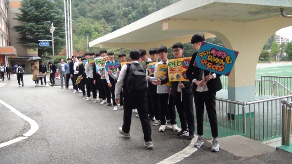 | 성의중학교(교장 구철수)는 지난 10일(수) 오전 8시 교직원 및 학생이 함께하는 학업중단예방 캠페인 행사를 실시하였다. 청소년기 학업중단 이후의 삶에 대한 성찰 없이 학업을 중단하는 사례를 방지하고, 위기 학생 지원을 위한 캠페인의 필요성에 따라 실시하게 되었다.