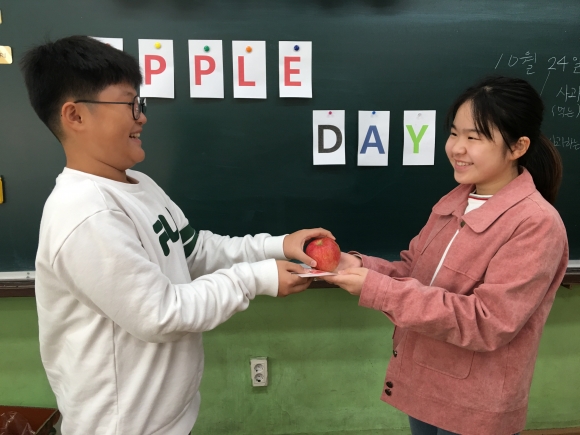 애플데이는 둘(2)이 서로 사(4)과하고 화해하는 날로 ‘나로 인해 마음 아팠을 사람’에게 애플데이를 통해 평소 미안했던 친구와 감사한 선생님께 학생들의 마음을 표현할 수 있는 기회를 마련하고자 하였다.