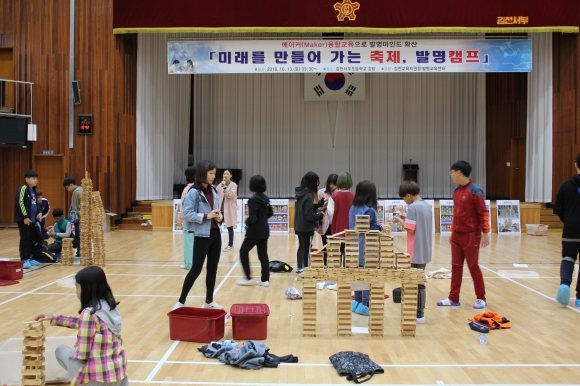 | 경상북도김천교육지원청(교육장 신정숙) 발명교육센터는 지난 10월 13일에 「미래를 만들어 가는 축제, 발명캠프」를 실시하였다. 발명기본과정, 1일 발명교실에 참가한 학생들을 대상으로 실시한 이번 행사는 학생들의 협동정신을 기르고 발명 소질을 살려 ‘행복한 미래를 준비할 수 있는 교육’을 하였다. 김천발명교육센터 장영희 담당교사의 지도로 1부에서는 카프라로 건축물 만들기를 통한 창의성과 협동심을 기르는 활동을 하였고, 태양광 자동차를 조립하여 경기함으로써 도전의식을 길렀다. 2부에서는 골드버그를 통한 과학적 원리를 습득하여 미션을 수행함으로써 문제해결능력을 함양하였고, 3D프린터 모델링으로 나만의 악세서리 만들기를 진행하여 학생들 모두 열정적으로 참여하였다. 특히 자신이 모델링한 작품이 3D프린터로 출력되는 모습을 흥미진진하게 지켜보고, 내가 생각한 아이디어로 진정한 메이커(Maker)가 되는 기초를 다지는 시간이 되었다.