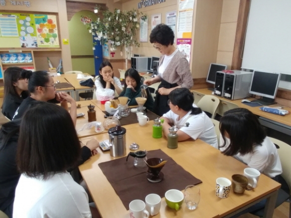 | 김천 한일여자중학교(교장 이영민)는 교육복지우선지원사업의 일환으로 5월부터 2,3학년 13명의 학생들과 본교 장인숙선생님이 함께 ‘바리스타교실’을 진행하고 있다. 바리스타교실은 중학생들이 가장 배우고 싶어하고 선호하는 바리스타를 통해 재능과 적성을 계발하고 자신감 향상 및 학교생활의 즐거움을 높이기 위한 프로그램이다.
