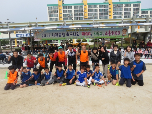| 아천초등학교(교장 이용옥)는 지난 22일 2018 사제동행 축구대회 ‘뛰GO, 달리고GO, 소통하GO’를 실시하여 본교 및 능치분교장 4, 5, 6학년 대표선수가 한 팀이 되고 3학년 대표선수와 교직원이 한팀이 되어 경기를 펼쳤으며 전교생 74명과 전교직원이 응원에 참가하였다.