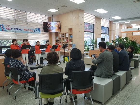 시민들의 재능기부로 시작된 「시민과 함께하는 행복민원실」작은 음악회는 지난 8월 팬플룻, 오카리나 연주로 시민들의 큰 호응을 받은바 있고, 이번 황악 하모니카 연주단의 개똥벌레, 편지, 오빠생각, 조개잡이 등 추억의 곡 연주는 민원실을 방문한 시민들에게 깊어가는 가을정취를 선물하였다.