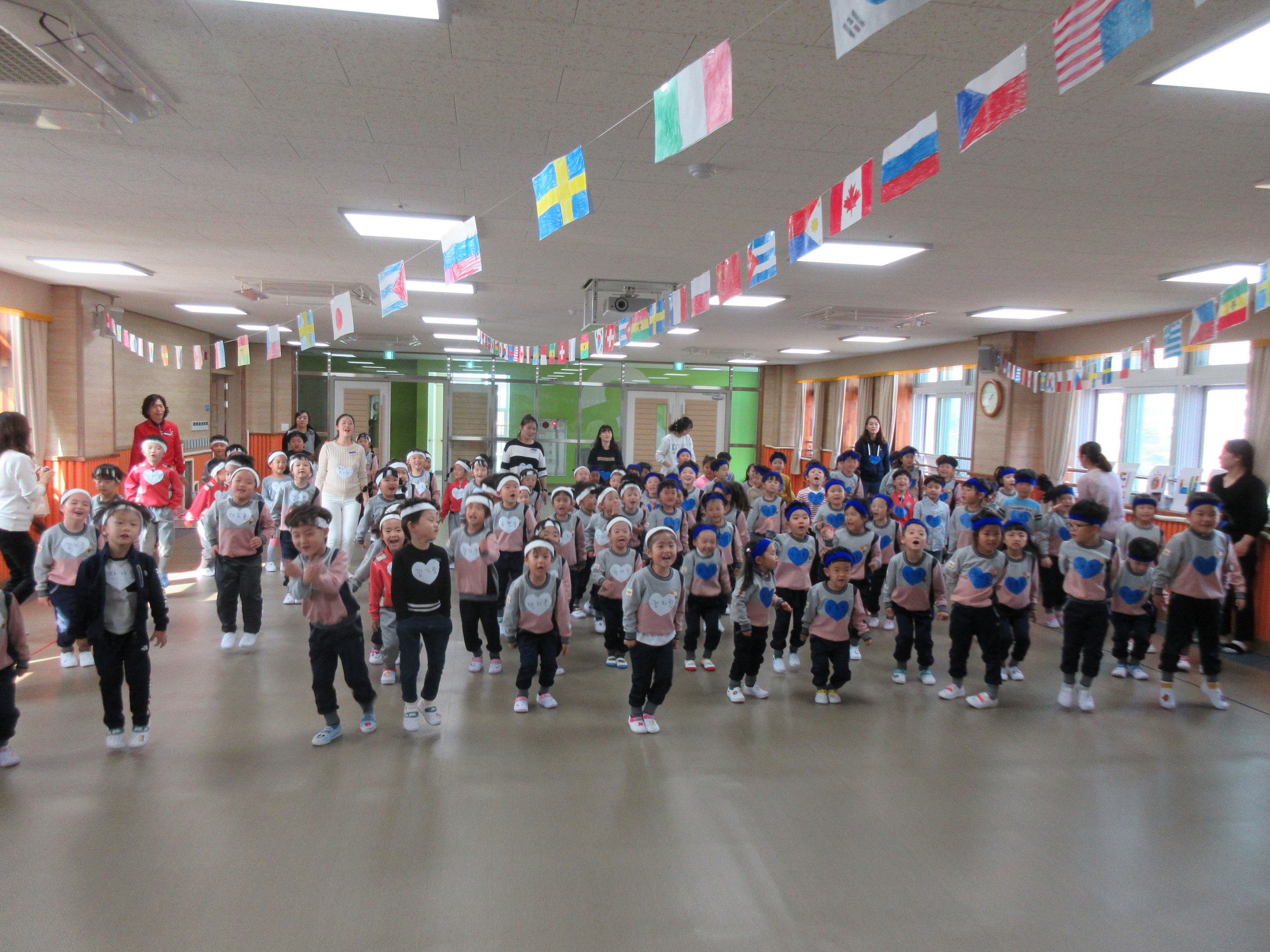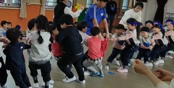 | 마지막으로 줄다리기를 할 때는 강당에 모든 유아들이 힘을 모아서 자신의 팀을 응원하는 소리로 가득했다. 이◯◯ 어린이는 “줄다리기를 할 때 최선을 다해서 응원했어요.”라고 말하였다. 청팀과 백팀은 막상막하로 점수를 얻고, 마지막에 무승부로 끝나게 되었다.