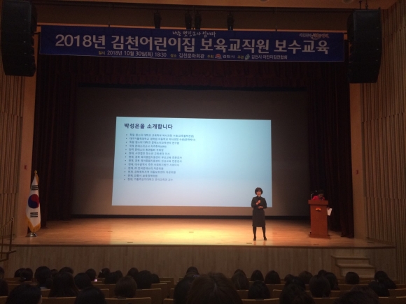보수교육은 부모들이 자녀를 안심하고 맡길 수 있는 보육환경 조성을 위한 목적으로 안동가톨릭상지대 박성은 교수를 초청,‘나는 멋진 교사입니다.’라는 주제로 보육 일선현장에서 앞장서서 노력하는 김천시 관내 보육교직원들은 아이가 행복한 보육환경 조성을 위해 보육업무가 끝난 저녁시간에도 2시간 가량 동안 이어진 교육에 열정을 보였다.