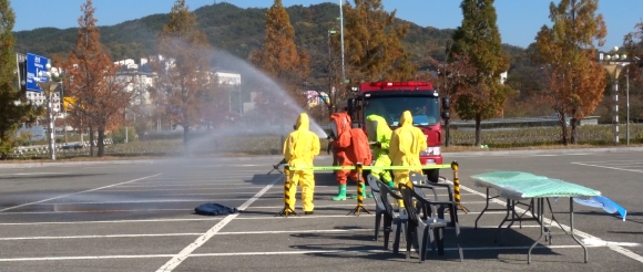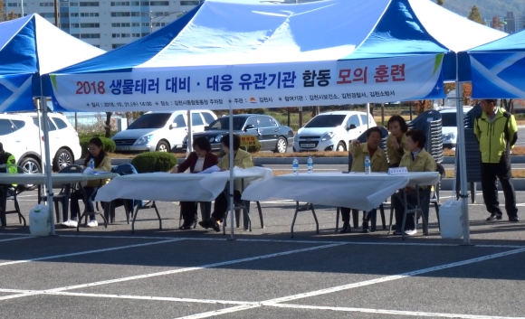| 김천시(시장 김충섭)는 김천경찰서, 김천소방서 등 유관기관 50여명이 참가한 가운데 지난 10월 31일 김천시 종합스포츠 타운 주차장에서 2018년 생물 테러 대비·대응 유관기관 합동 모의훈련을 실시하였다.