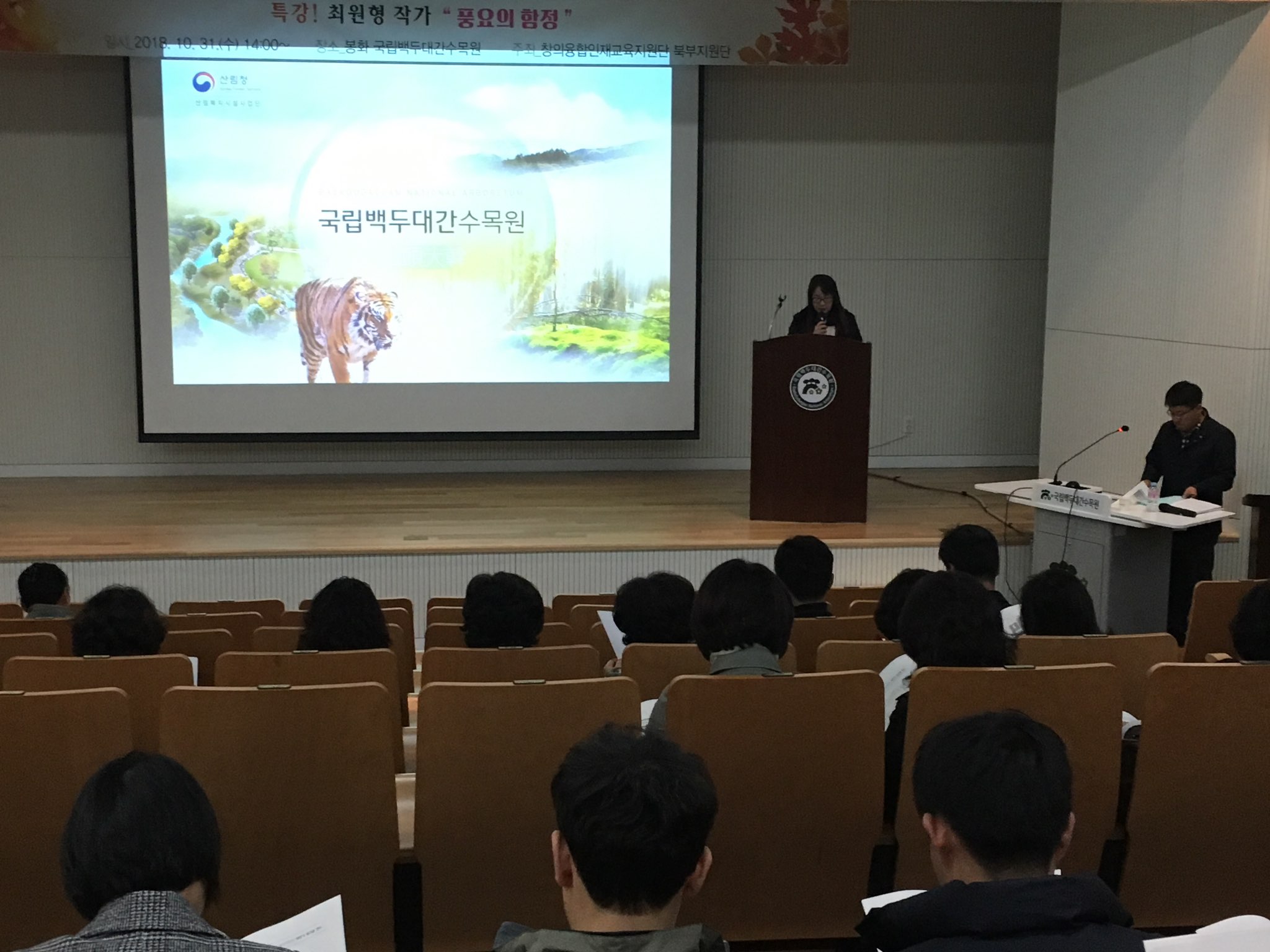 | 경상북도교육청은 지난 10월 31일 국립백두대간수목원과 김천 녹색미래과학관에서 창의융합인재교육 북부지원단 및 서부지원단 회원 100여명이 참석한 가운데 2018년 하반기 워크숍을 개최하였다. 국립백두대간수목원에서 진행된 북부지원단 워크숍은 최원형(기후변화대응 아시아시민사회컨퍼런스 한국조직위원)의 특강을 통해 인문학에서 바라보는 환경과 생태이야기를 들을 수 있었고, 김천 녹색미래과학관에서 진행된 서부지원단 워크숍은 ‘4차 산업혁명시대 대비한 창의융합교육의 방향’이라는 주제로 오기영(충남대학교 교수)의 특강이 진행되었다.