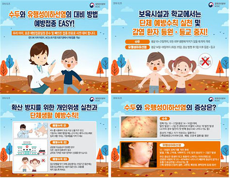 아울러, 의심증상이 나타나면 곧바로 가까운 의료기관에서 진료를 받고, 다른 사람과의 접촉을 최대한 피하기 위해 전염기간 동안 등교(학원 포함)를 하지 않도록 학교와 학부모님들의 적극적인 협조가 필요하며, 특히 보육시설, 학교 등에서 발생이 많으므로 시설 내 수두 또는 유행성이하선염 집단 환자 발생 시 추가 확산을 막기 위해 발생 상황을 관할 보건소에 알려줄 것을 권고하였다.