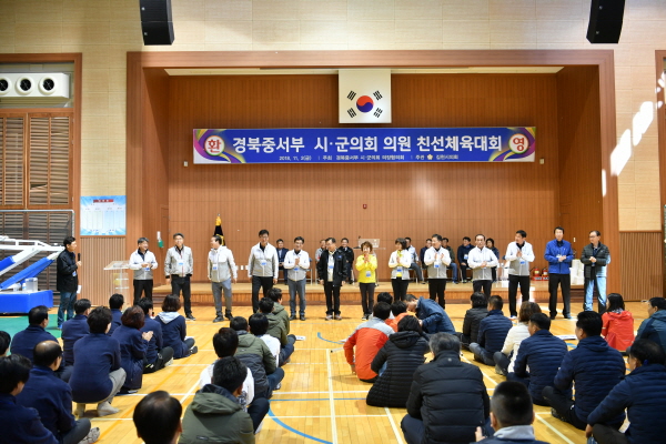 |  | | | ⓒ 김천내일신문 | | 종합스포츠타운 내 김천국민체육센터에서 11월2일 김천시의회를 비롯한 구미, 상주, 고령, 성주, 칠곡 등 경북 중서부지역 6개 시군의회 의원들과 사무국 직원들의 친선도모를 위한 체육대회가 열렸다. 경북 중서부 6개 시군의회 친선체육대회는 경북 중서부 지역 6개 시군의회 간 친목과 다양한 정보 교환으로 지역사회가 상생 발전하는 계기를 마련하고 의원 상호간의 화합을 다지기 위한 목적으로 개최되었다. 이날 체육대회는 김천시, 구미시, 상주시의회와 군부연합팀 등 4개팀으로 나뉘어 족구와 배구 경기를 통해 스트레스 해소와 활력을 충전하면서 주민들의 열망에 부응하는 의정활동을 펼치기 위한 에너지를 결집하는 한편, 각 의원들은 각 지역의 명성을 걸고 열정적으로 경기에 임하면서도 경기 내내 웃음이 끊이지 않는 화기애애한 분위기 속에서 진행되었다. 지난 9월 19일 경북 중서부지역 시․군의회 의장협의회 정기총회에서 회장으로 선출되어 협의체를 이끌고 있는 김세운 김천시의회 의장은 인사말을 통해“바쁜 일정에도 불구하고 오늘 단합대회에 참석해 주신 각 지역의 의원님과 사무국 직원 여러분께 감사드리며, 오늘 행사를 통해 의원 간 교류와 소통, 화합의 기회가 되고 각 지역이 상생 발전하는 밑거름이 되기를 바란다.”라고 했다. 김충섭 김천시장은 환영사를 통해“의원님들의 김천방문을 환영하며 오늘 단합대회를 계기로 중서부지역 6개 시․군 의회가 하나로 뭉쳐 화합과 친목을 돈독히 하여 경북 중서부지역이 상생 발전하는데 큰 힘이 되어 달라.”라고 인사말을 건넸다. 한편, 경북중서부지역 시군의회 의장협의회 친선체육대회는 지난 2013년 제1회 대회를 시작으로 올해로 4회째를 맞으며, 김천에서는 지난 2014년 제2회 대회를 개최한 이후 두 번째이다.