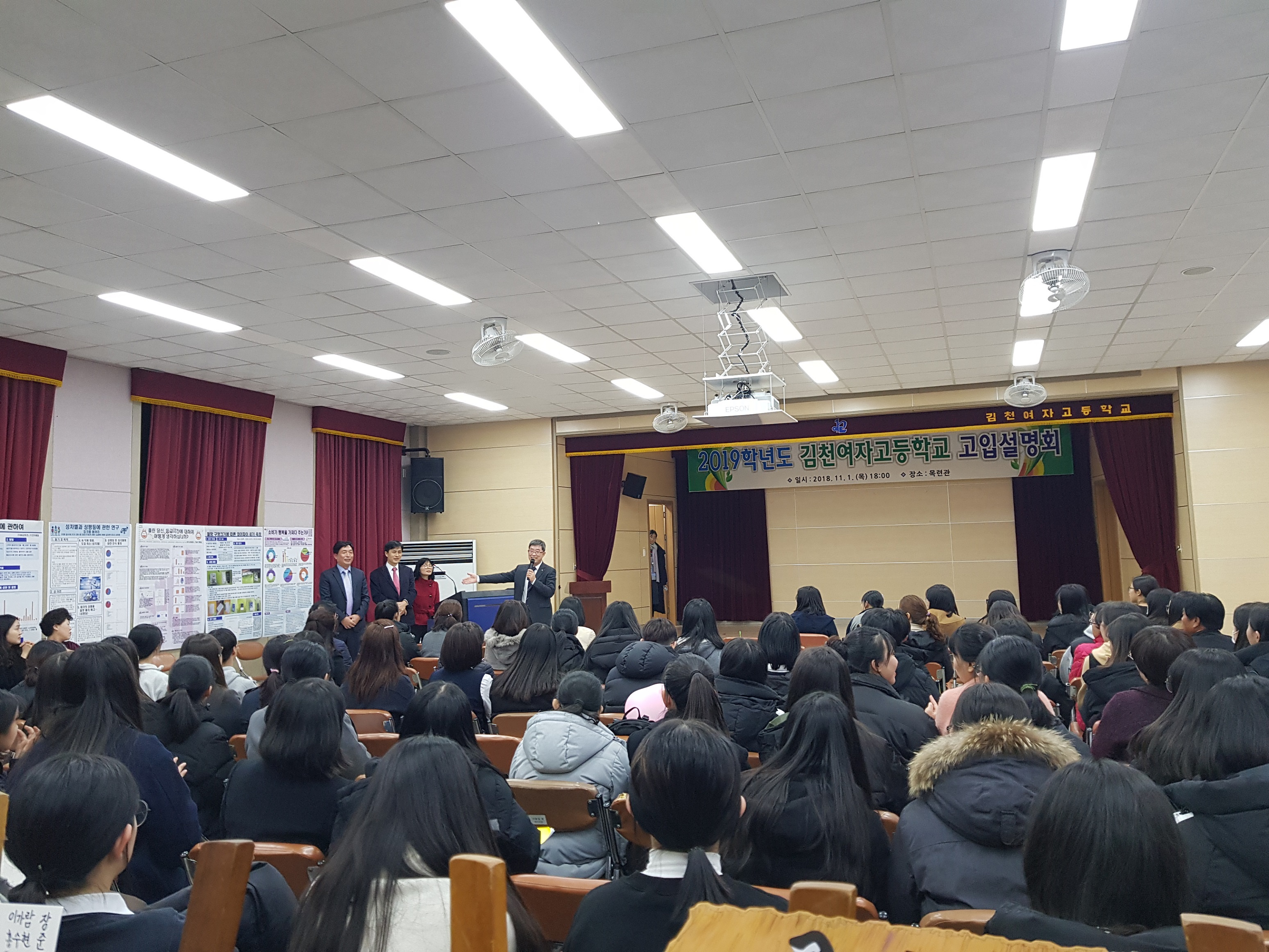 한편, 학술제와 병행하여 11월 1일 학교 목련관에서 개최했던 2019학년도 김천여고 입학설명회에는 관내 중학생, 학부모가 참석하여 진학에 대한 뜨거운 관심을 보였다. 1시간 30여 분에 걸쳐 진행된 이날 행사는 ‘2022 대학입시제도 바로 알기’란 주제로 참석한 학부모와 학생들의 관심을 이끌어냈고, ‘김천여고를 선택해야 하는 이유’란 주제의 설명회에서는 김천여고만의 교육과정 소개로 참석자들의 시선을 단연 고정시켰다. 더욱이 이 자리에서는 학생들이 직접 제작한 학교교육활동 영상물이 소개되어 우레 같은 박수를 받기도 하였다.