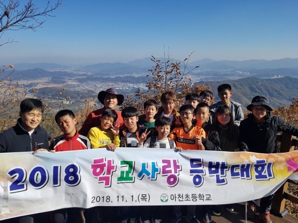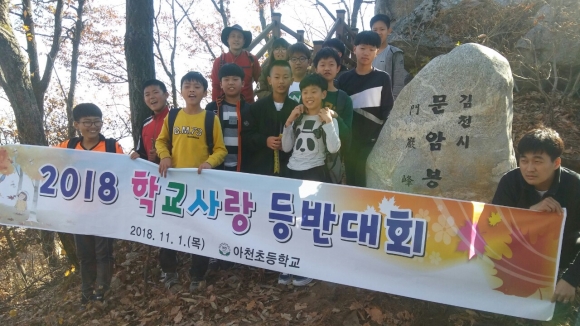 | 아천초등학교(교장 이용옥)는 지난 11월 1일 2018 학교사랑 등반대회를 실시하여 본교 및 능치분교장 6학년 12명과 교감, 담임, 보조 교사들이 교가에 있는 어모면의 산봉우리인 문암봉(597.7m)을 등반하였다. 이날 등반은 문암봉이 교가에 있지만 위치나 가는 방법을 알고 있는 학생이 없고, 등반 경험이 있는 학생이 한명도 없다는 사실이 안타까워 실시하게 되었다.