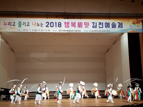 | 김천교육지원청(교육장 신정숙)은 지난 11월 9일 김천시문화예술회관에서 2018년 행복씨앗 김천 예술제를 개최하였다. 각 학교를 대표하는 23개의 공연 팀이 음악과 무용 공연을 선보이며 한 해 동안 갈고 닦은 기량을 마음껏 발휘하였다.