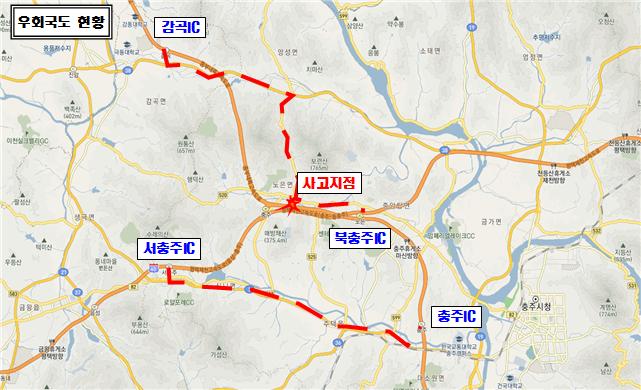 이에 따라 도로공사는 중부내륙선 창원방향은 감곡IC로 진출하여 국도 38호선, 국지도 49호선 및 82호선을 이용하여 우회하고, 양평방향은 북충주IC로 진출하여 국지도 82호선 및 49호선, 국도 38호선을 이용하여 우회하도록 당부했다. 평택제천선을 이용하는 차량은 서충주IC에서 진출하여 국도 3호선을 이용하면 된다. |