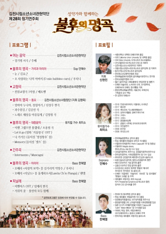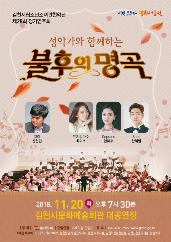 | 김천시문화예술회관(관장 김금숙)에서는 11월 20일 오후 7시 30분 대공연장에서『시립소년소녀관현악단 제28회 정기연주회』를 개최한다.