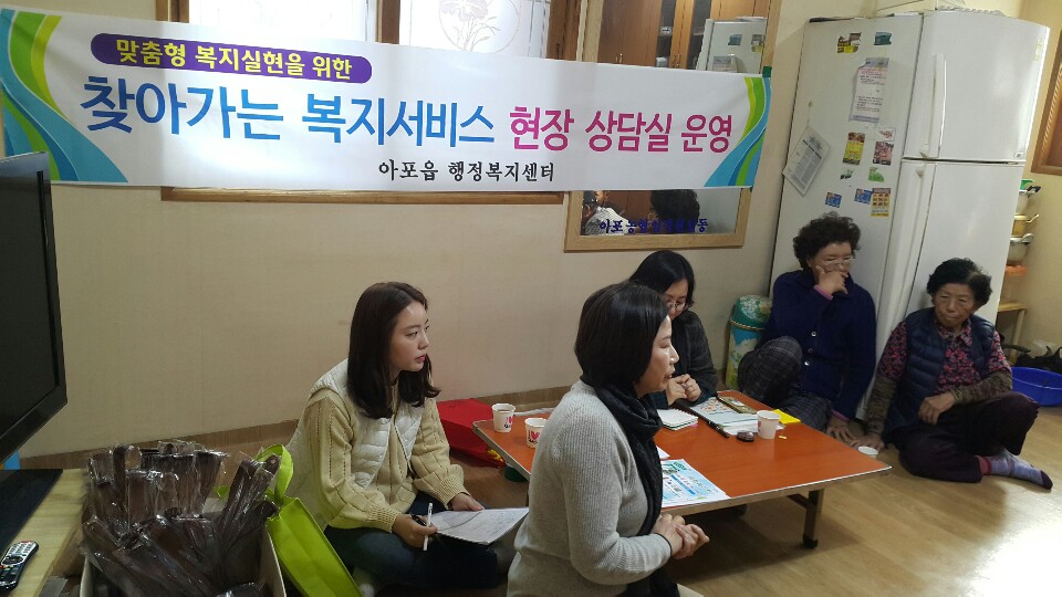 | 아포읍행정복지센터 맞춤형 복지팀은 평소 복지서비스에 대해 궁금한 사항이나 문의가 있어도 이동이 불편하여 행정기관을 잘 찾지 못하는 취약한 주민들을 위하여 각 마을 경로당이나 마을회관에 현장 상담실을 운영하였다.