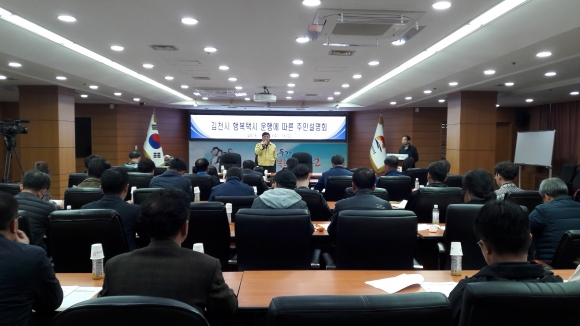 | 김천시는 7월부터 시내버스 미운행 지역 등 대중교통 이용 접근성이 취약한 지역 주민들의 교통불편을 해소하고 이동권을 보장하기 위해 행복택시를 시범 운행하였고, 2019년 1월부터 전면 확대 시행 계획에 따라 시청2층 회의실에서 해당 마을에 대하여 주민설명회를 개최하였다.