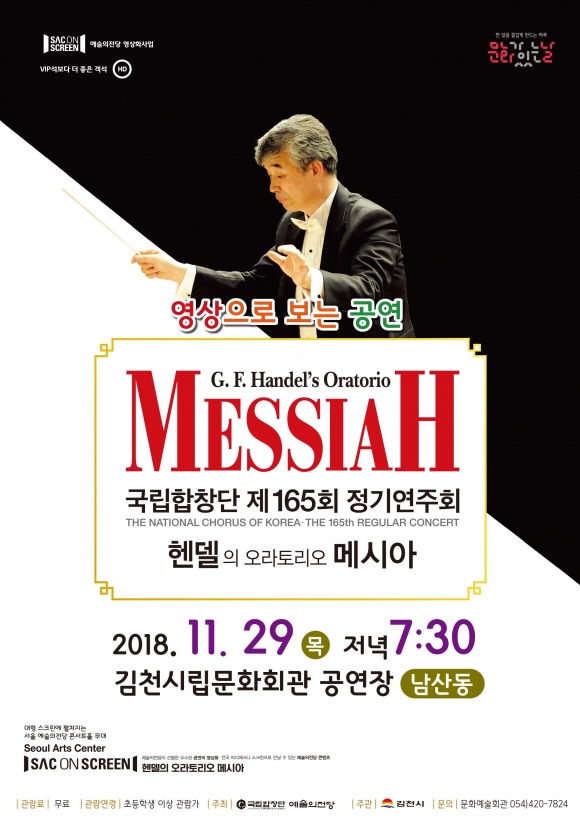 | 김천시문화예술회관(관장 김금숙)에서는 영상으로 보는 공연 <헨델의 메시아>를 오는 11월 29일 오후 7시 30분 김천시립문화회관 공연장(남산동)에서 무료로 상영한다.